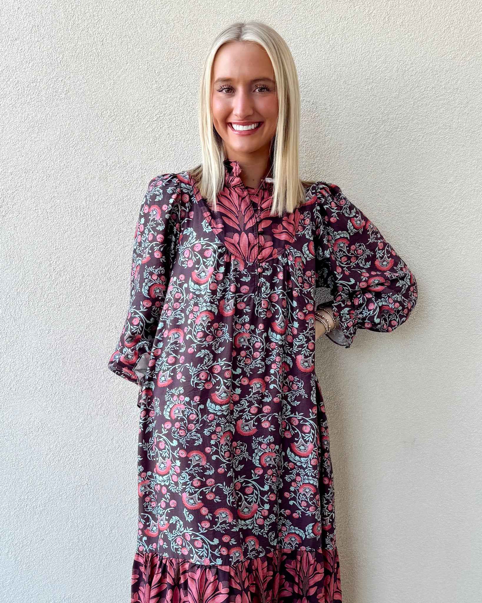 Meet your new fall favorite! Our Maple Garden Midi features a charming mixed floral print with warm berry and mocha tones that feel straight out of an autumn daydream. Designed with a relaxed babydoll fit, button neckline, and flowy tiered hem — this dress is equal parts comfy and cute.